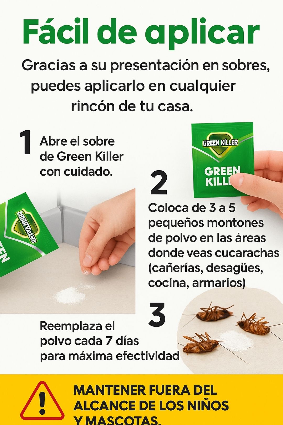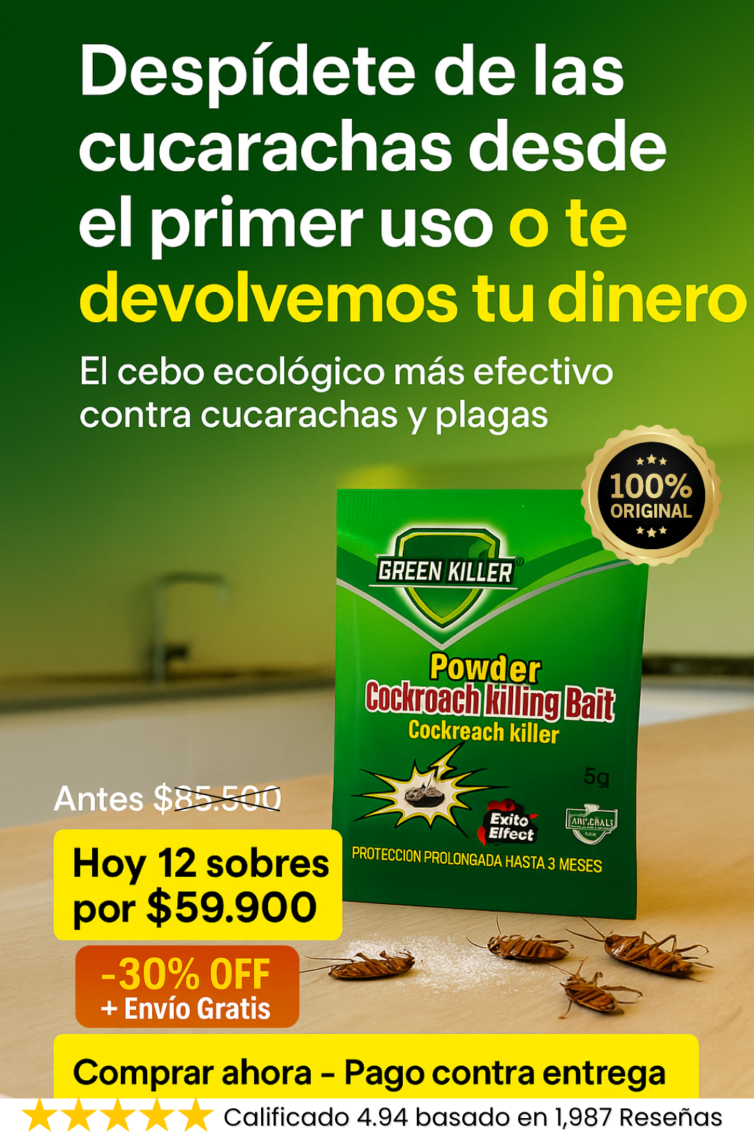 Tenía una plaga en mi cocina que no lograba eliminar con aerosoles. Probé Green Killer y en dos días ya no quedaba ni una cucaracha. Lo mejor es que viene en sobres fáciles de usar